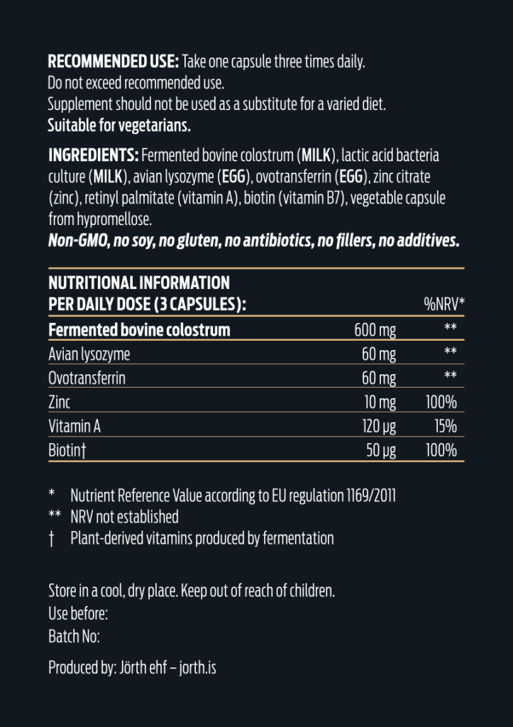 - Eflir ónæmiskerfið: Inniheldur gerjaða íslenska broddmjólk ásamt viðbættu lysozyme og ovótransferríni sem vinna sérstaklega gegn sýkingum og bólgum.